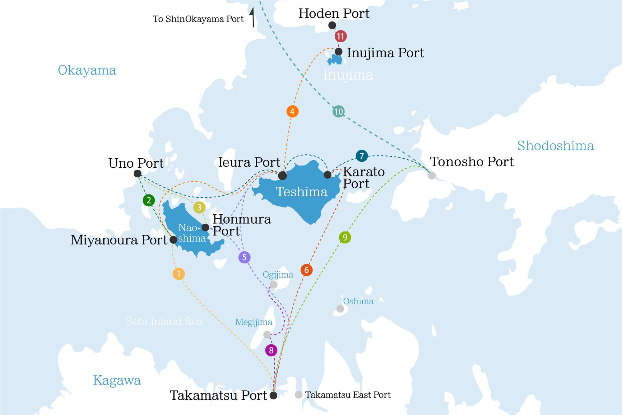 Please note that Ferries and Passenger Boat depart from different piers, both in Takamatsu and Tonosho.