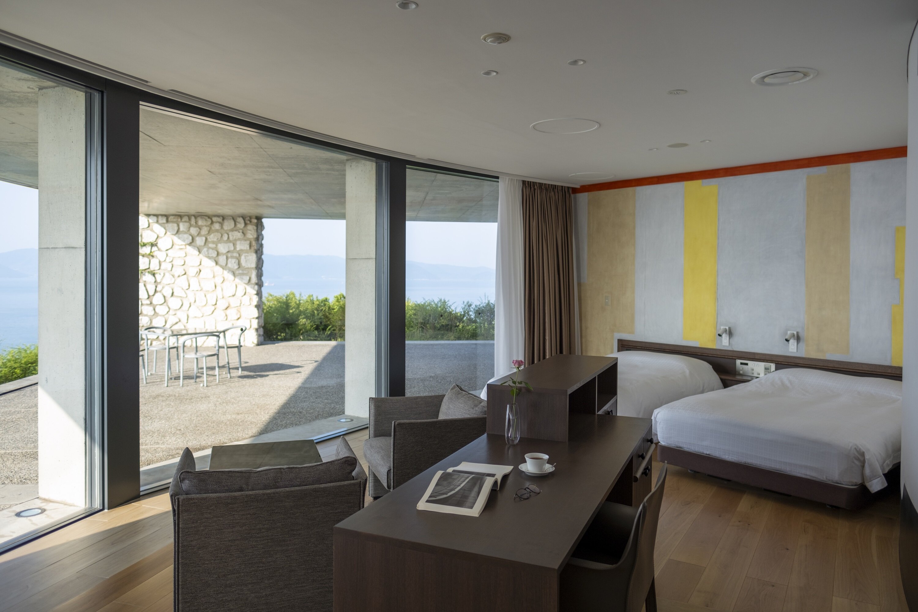 室内の床から天井までの大開口部からは瀬戸内海が一望でき、一部客室の壁にはアーティスト自身がドローイングを制作しています。