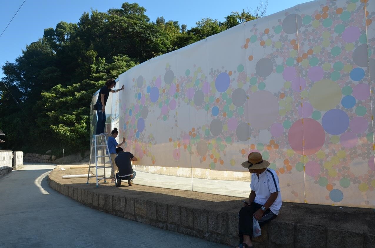《コンタクトレンズ》は透明なアクリルの壁が連なる犬島「家プロジェクト」S邸にて、2013年3月20日に公開されました。大きさや焦点距離の異なる円形レンズに周囲の木々や家々の軒先、小道を通る人々などが形や大きさを変えて映し出され、来訪者に目に見える世界の多様性を示しています。